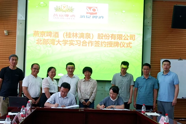 在燕京啤酒(桂林漓泉)股份有限公司,陈磊代表学校与燕京啤酒(桂林漓泉)股份有限公司签署教学实习协议,并为公司授予“pp模拟器游戏官网入口实践教学基地”牌匾。