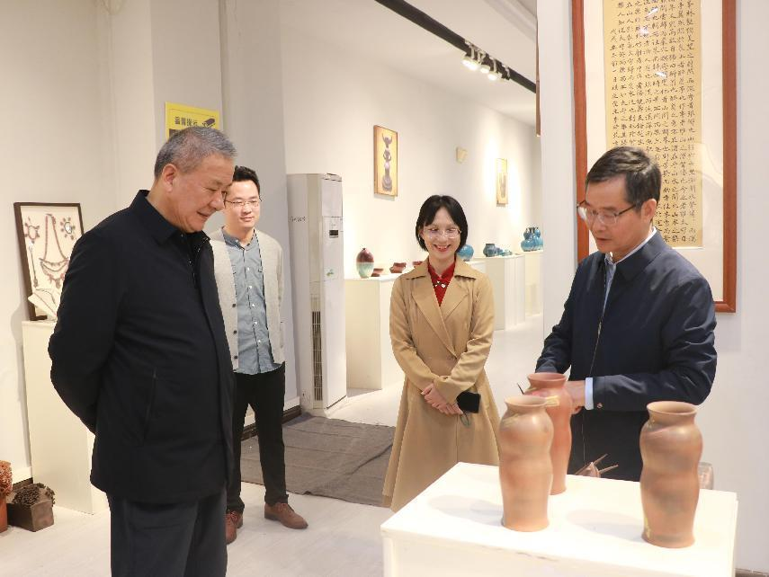 胡云腾(左一)实地考察学校坭兴陶艺术展馆