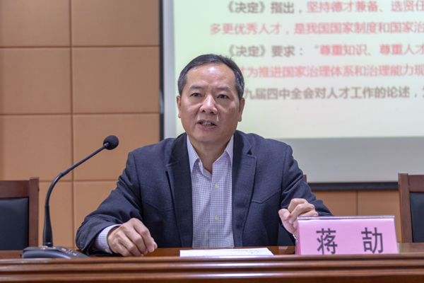 讲座上,蒋劼副厅长结合多年来参与自治区重大人才政策起草制定工作的实践经验,围绕新形势下人才工作新特点、广西人才工作现状和存在问题以及人才工作的思路与思考三个主要内容进行授课。他总结了党的十九届四中全会对人才工作的新定位,分析了新形势下人才工作特点。他分析了定位在广西发展的国家战略、人才争夺中广西的优势与劣势后指出,目前广西人才工作面临的重大机遇和艰巨挑战。蒋副厅长强调,要将人才、产业、政策等几个要素紧密结合,应清楚地知道“哪些地方需要人才”、“去哪里找人才”和“要找怎样的人才”。