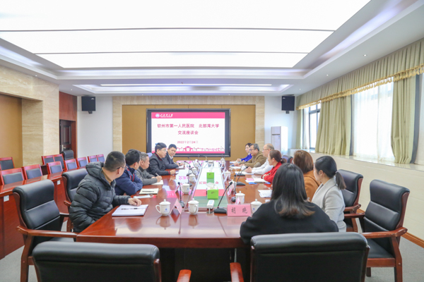 2月24日下午,钦州市第一人民医院党委书记黎华彪一行到校就党建工作、师生健康保障服务进行座谈交流。学校党委书记韩峻峰出席,党办校办、组织部、工会、离退处、校友办负责人参会。