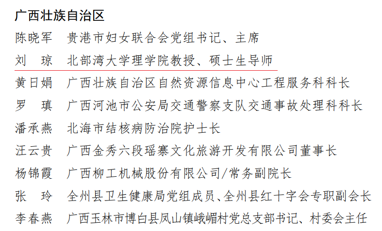 近日,全国妇联发布《关于表彰全国三八红旗手标兵、全国三八红旗手、全国三八红旗集体和全国巾帼文明岗、全国巾帼建功标兵、全国巾帼建功先进集体的决定》,授予蔡凤辉等298名优秀女性“全国三八红旗手”荣誉称号,广西有9名女性获此殊荣,pp电子发展规划处、研究生处长、理学院教授刘琼位列其中。