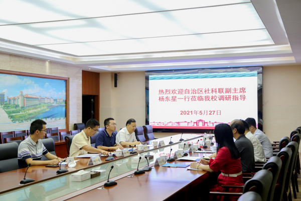 5月27日上午,自治区社科联党组成员、副主席杨东星一行到pp电子就社会科学发展进行调研。校党委常委、副校长陈磊,校党委常委、总会计师梁智出席会议。会议由科技处副处长、校社科联副主席朱念主持。