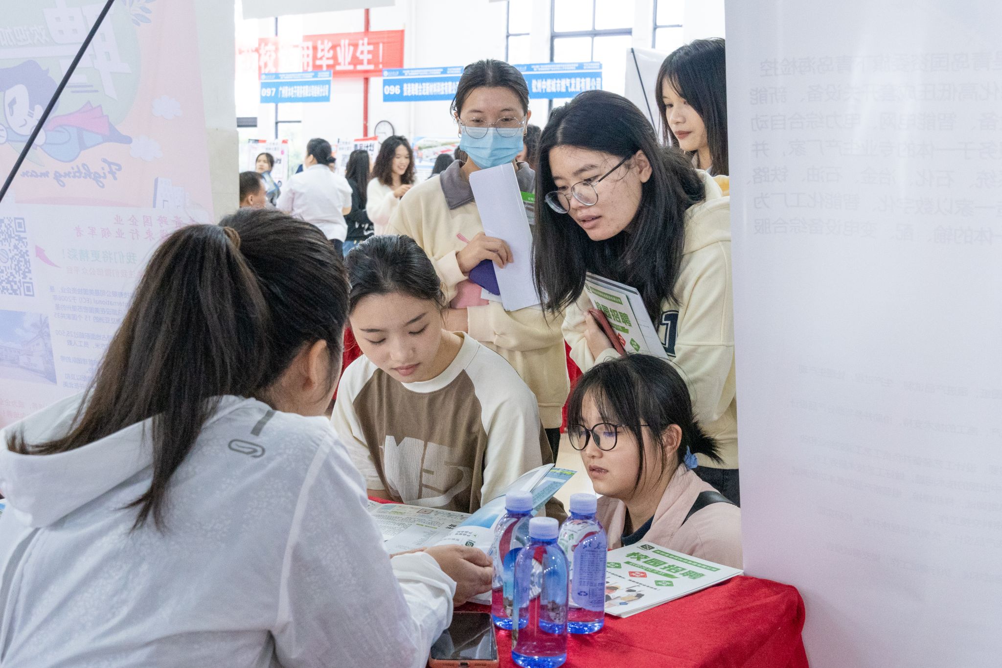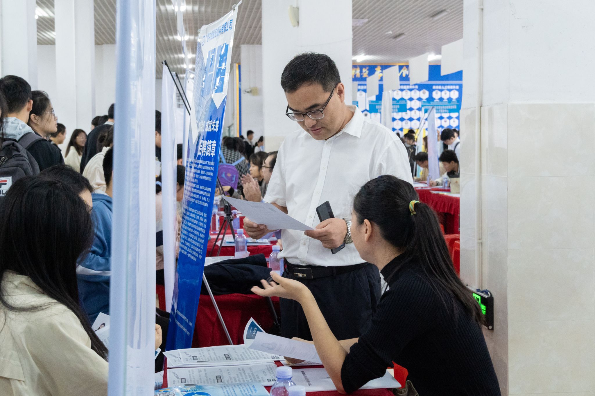 招聘会现场人头攒动,气氛热烈,毕业生们手持简历穿梭在各个用人单位展台前,不时停步驻足,寻找心仪岗位,积极与各用人单位就工作环境、工作内容、薪资待遇等问题进行深入交谈,详细了解各用人单位的信息与需求。