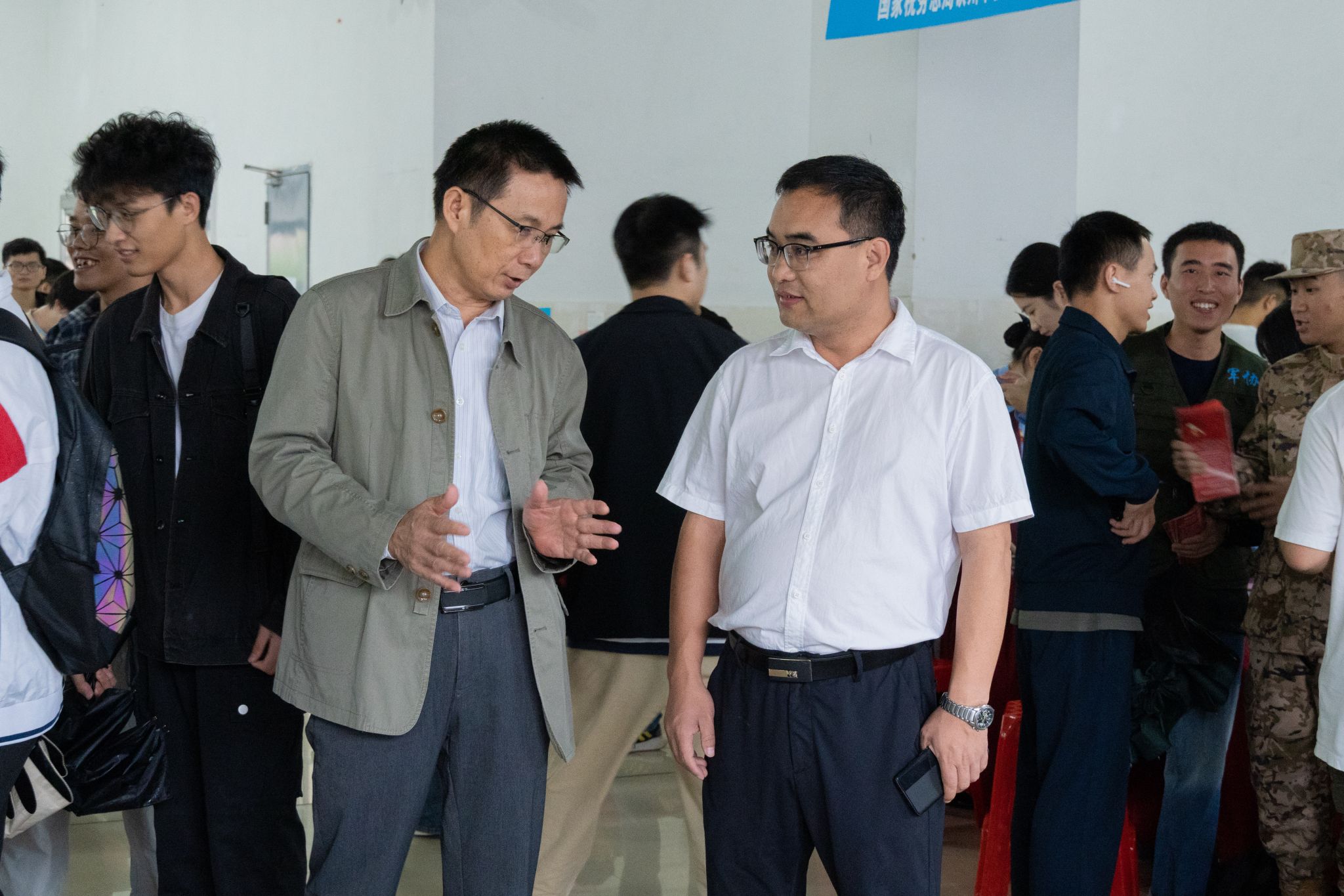 马秀明副校长(右)与招就处相关负责人了解现场招聘情况