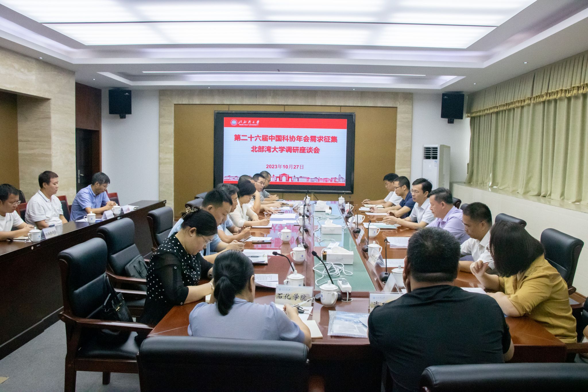 学校后勤服务集团、党委统战部、科技处、船舶海洋工程教研室、北部湾海洋发展研究中心相关负责人参加会议。(盘思思 摄)