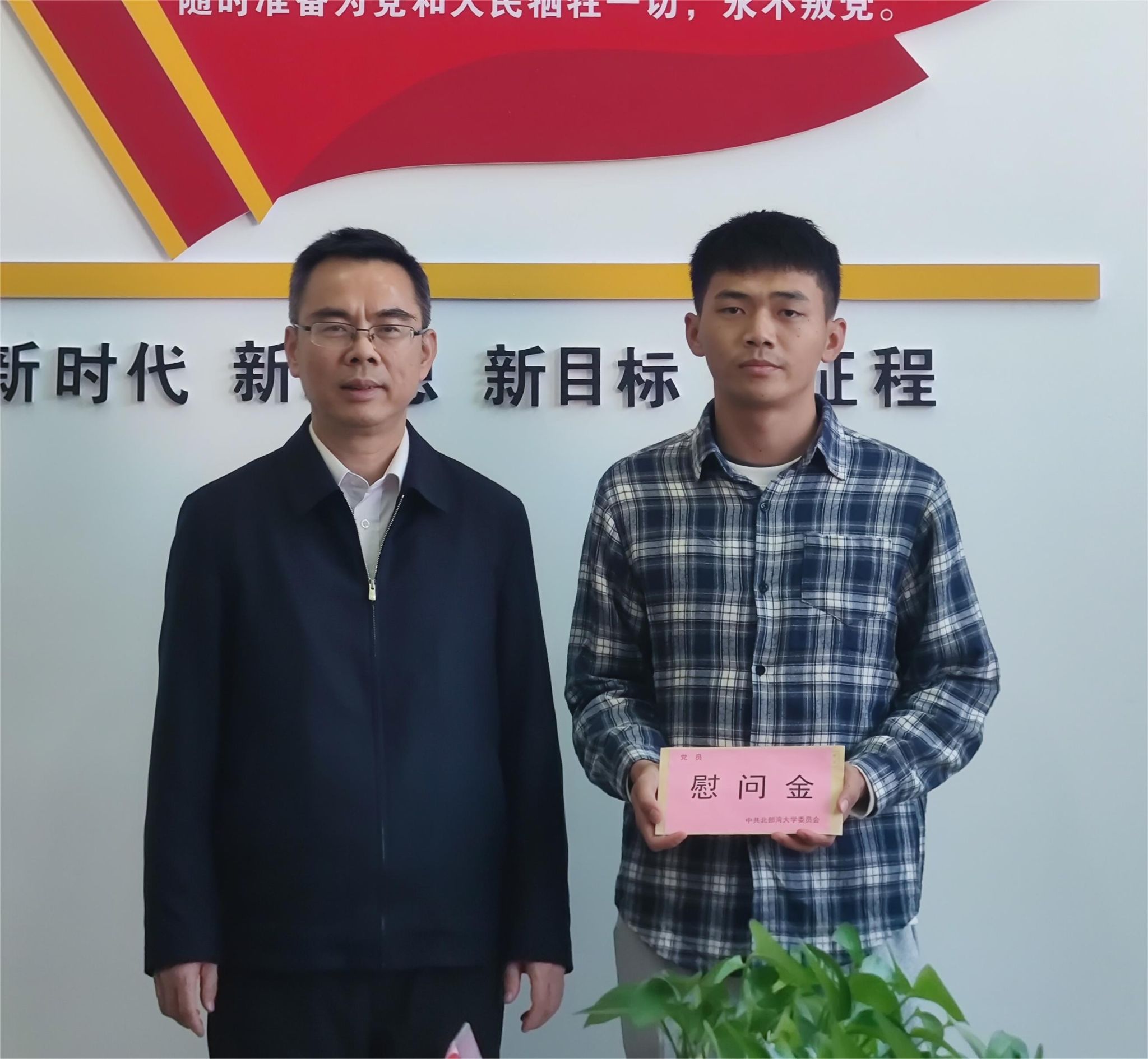 校党委副书记唐高华(左)慰问国际教育与外国语学院学生代表