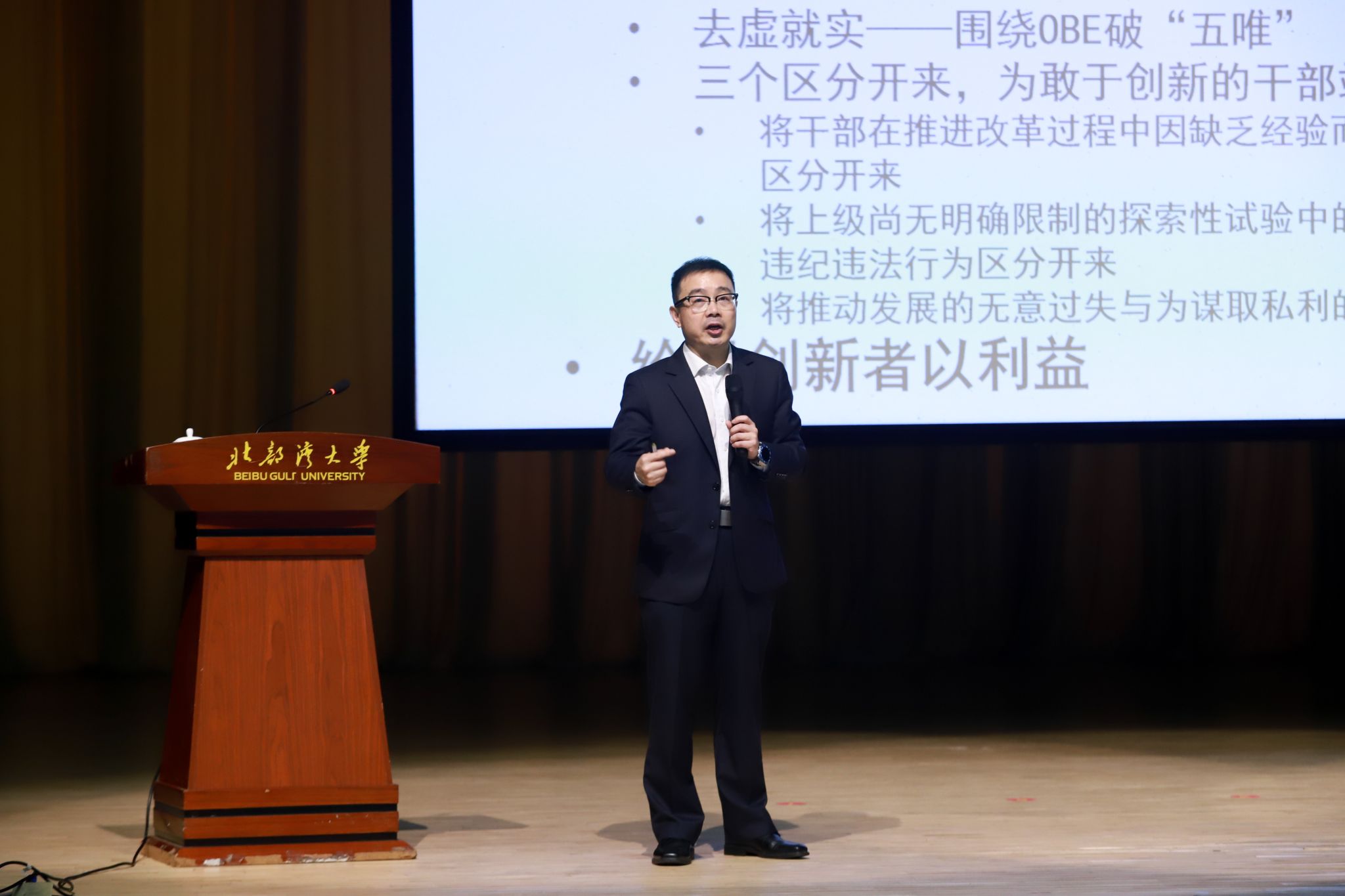 校党委书记徐华蕊作专题报告。他强调,学校要实现高质量发展,就要把习近平总书记对广西重大方略要求和习近平总书记系列重要论述学到深处、落到实处。一要解放思想,提高认识,坚持把立德树人作为根本任务,立足学校海洋性、应用型、国际化的办学特色,瞄准社会需要,打破学科专业壁垒,对现有学科专业体系进行调整优化,不断提高人才培养质量,着力培养社会需要的时代新人。二要创新求变,深化改革发展,敢于打破思维定式,充分发挥学校的优势潜能,拉动创新的动力引擎,增强新动能新优势,汇聚高质量发展合力,团结一心围绕人才培养质量提升稳抓落实,实现错位发展。三要向海图强,坚持“立足北部湾,服务国家战略需要,面向全国,辐射东盟”的办学特色。全校上下要形成服务于广西乃至国家的向海图强视野,进一步实现学校专业、学科、师资、科研向海发展,加快涉海涉港涉运河的应用型人才培养,为学校高质量发展凝聚向海合力。四要开放发展,勇于跳出既有的成绩看待学校发展,开放办学,为自身发展而勇于、敢于、善于向政、企、校、其他机构借力借势,大胆试大胆想大胆干,以开放发展的思维推动学校高质量发展。
