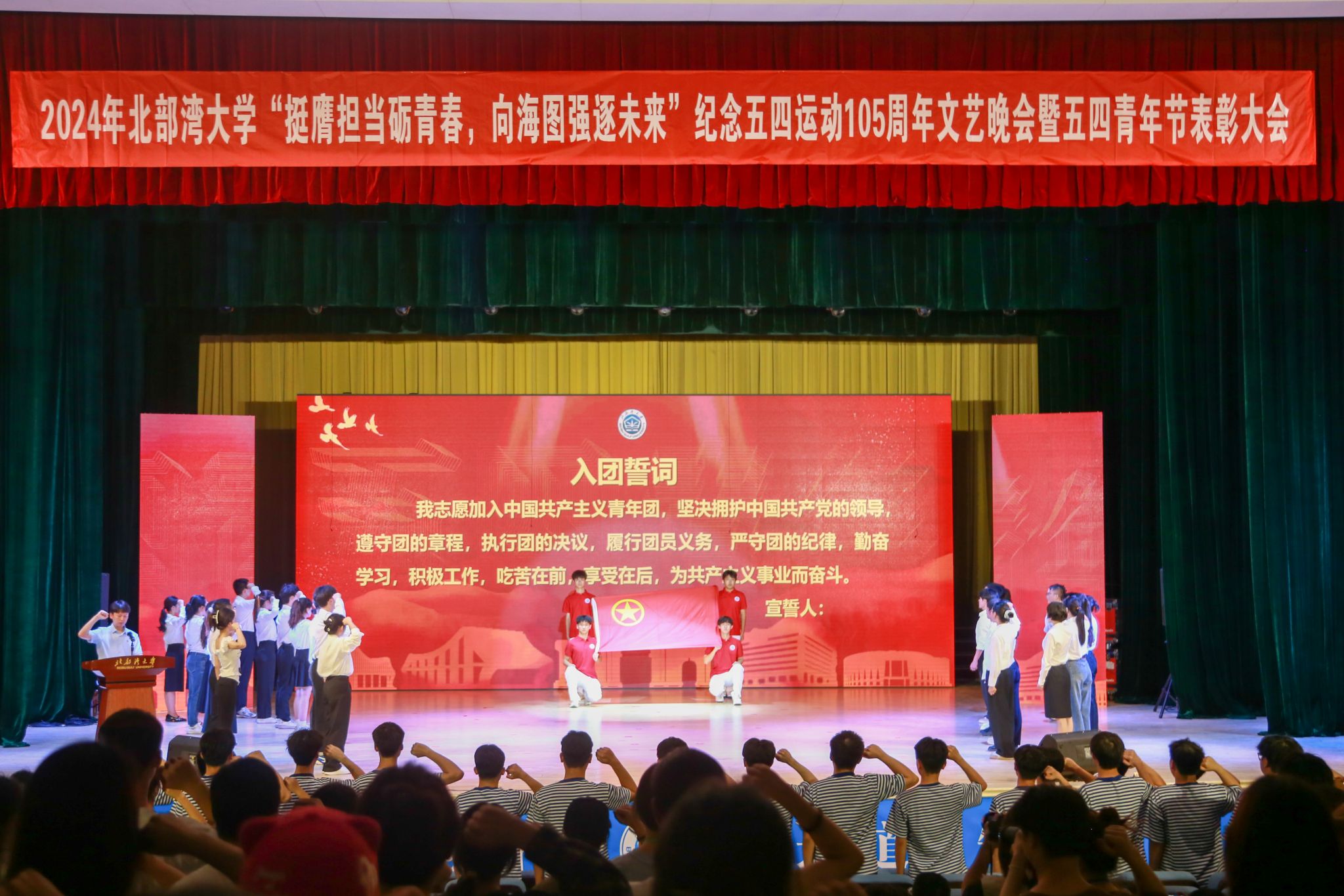 入团仪式及重温誓词环节,全场共青团员面向团旗,紧握右拳,满怀理想与使命担当,庄严宣誓。