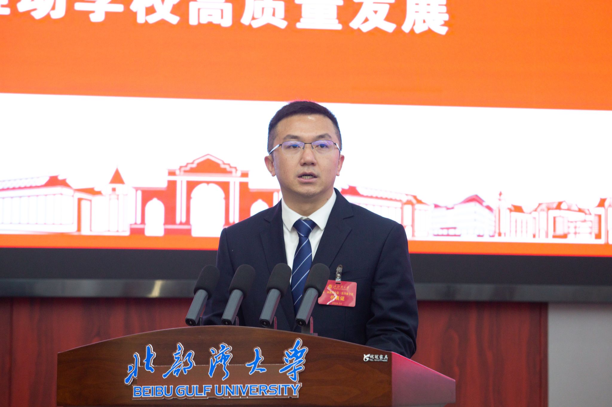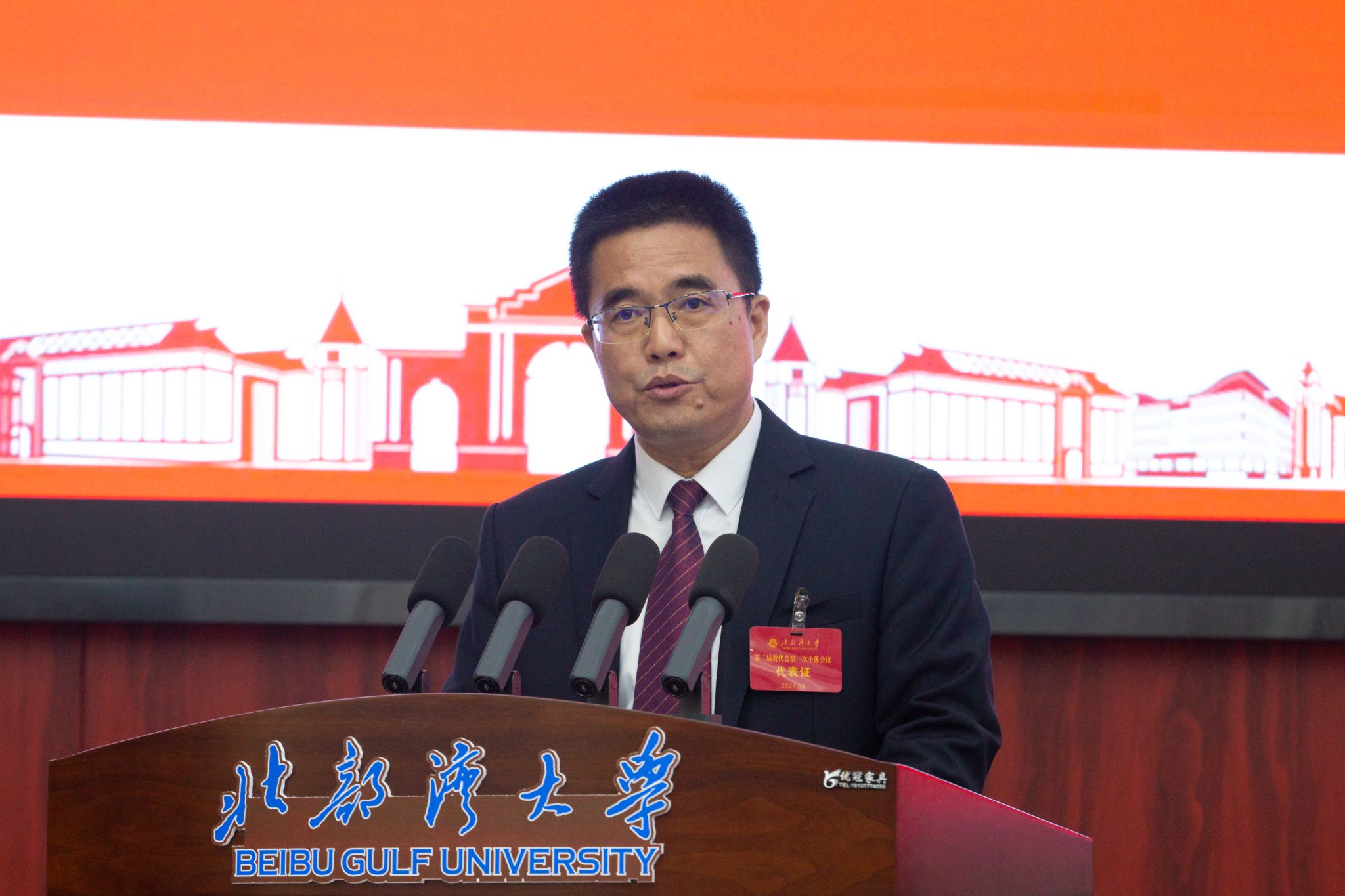 校党委副书记、校长苗剑向大会作学校工作报告。报告中回顾了学校2023年的工作情况和布置了学校2024年的主要工作任务。他指出,过去的一年,学校坚持以习近平新时代中国特色社会主义思想为指导,深入贯彻落实习近平总书记对广西重大方略要求,坚定贯彻落实自治区决策部署,认真落实立德树人根本任务,学校各项事业谋划新布局,展现新气象。他表示,2024年是全面贯彻落实党的二十大精神的关键之年,是深入实施“十四五”规划的攻坚之年,也是学校推进申博建设的重要一年。学校要坚持稳中求进,把全面提高人才自主培养质量、支撑高水平科技自立自强作为主攻方向,把进一步深化重点领域改革作为根本动力,全力推进本科教育教学审核评估,努力开创海洋特色鲜明的高水平应用型大学发展新局面,为奋力谱写中国式现代化广西篇章做出新的贡献。