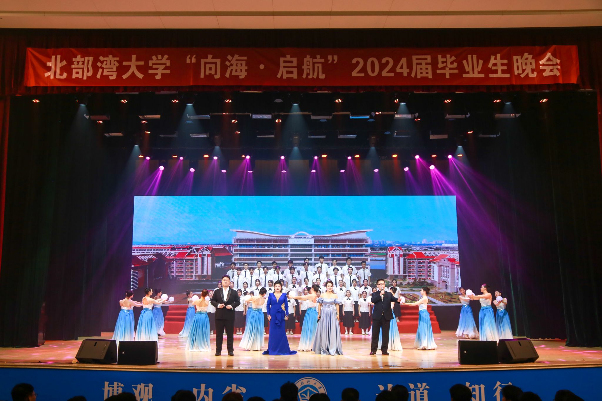 晚会开场,歌曲《想去海边》奏响湾大人心中的向海之志,民歌《云之南》则将广西的民族之美徐徐呈现,现场的气氛渐入佳境。当合唱《踏歌回故乡》奏响,毕业晚会正式拉开帷幕。