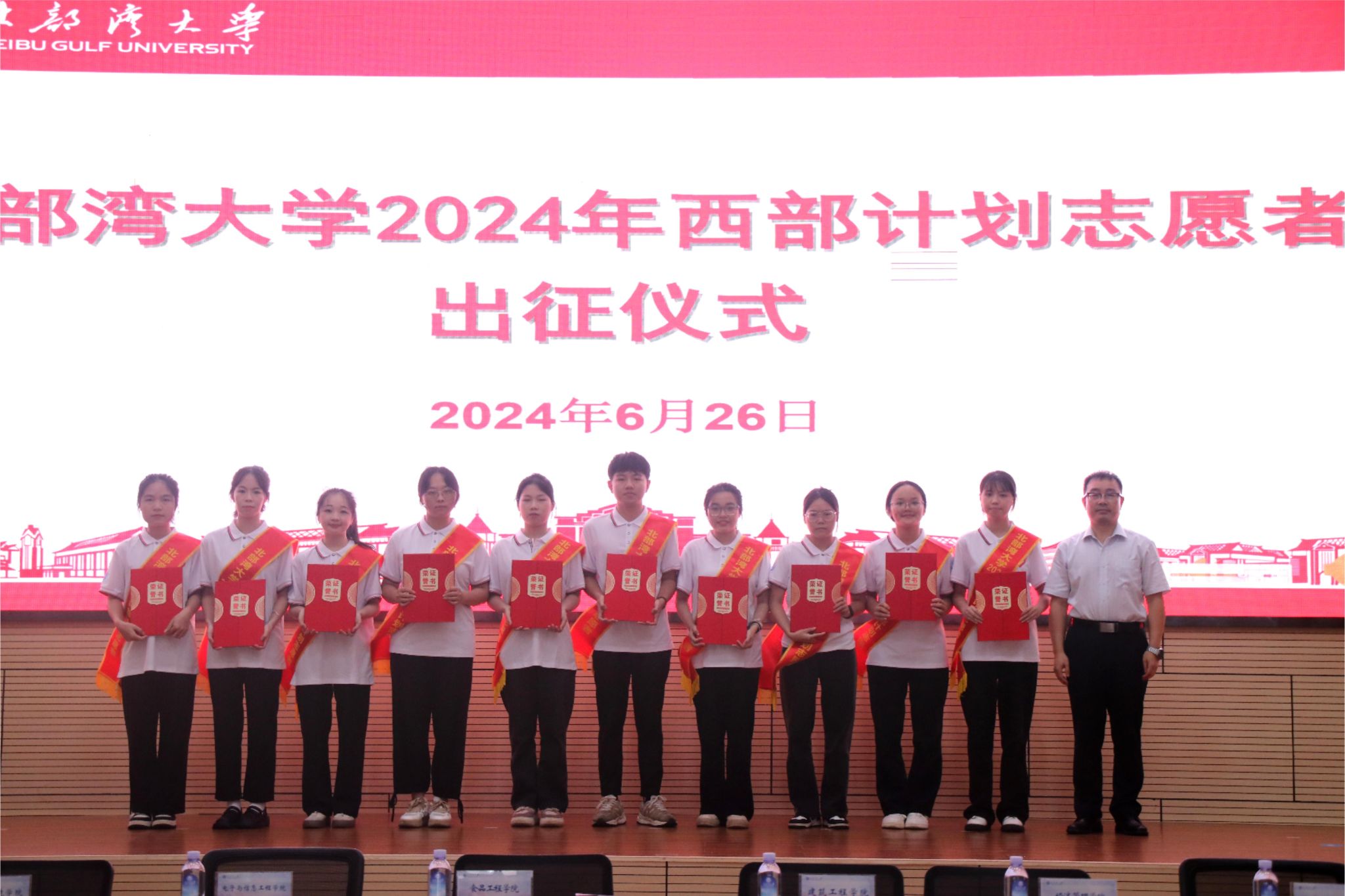 与会领导为西部计划志愿者们佩戴绶带、授予旗帜,并发放行囊礼包及奖金。