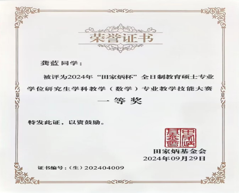 9月27日至30日,2024年全国“田家炳杯”全日制教育硕士专业学位研究生学科教学(数学)专业教学技能大赛决赛暨数学教师教育实践创新论坛在上海交通大学举办。pp电子师生首次参加全国决赛,来自理学院2023级学科教学(数学)教育硕士龚蓝在比赛中脱颖而出获得全国一等奖,其导师梁好翠获优秀指导老师荣誉称号。