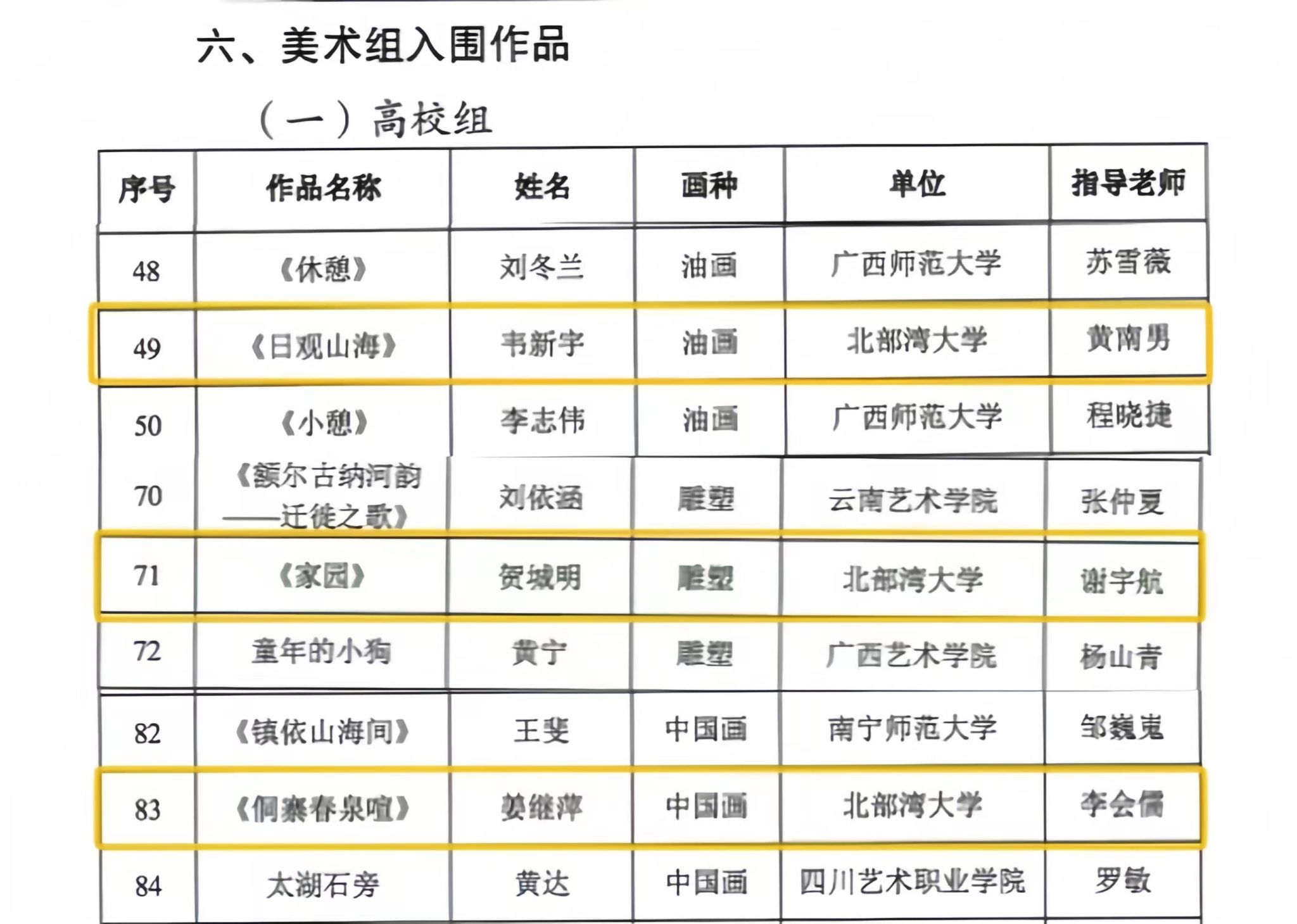 《藤缠树》《蝴蝶飞》《陶燃》等3项作品获舞台组最佳作品,《你赢得了诉讼》等5项作品获舞台组优秀作品,《一窝雀》等7项作品获舞台组入围作品,《日观山海》等3项作品获美术组入围作品,《广西海洋文化浸润高校美育:内在耦合、价值意蕴与实施路径》获论文组优秀作品。