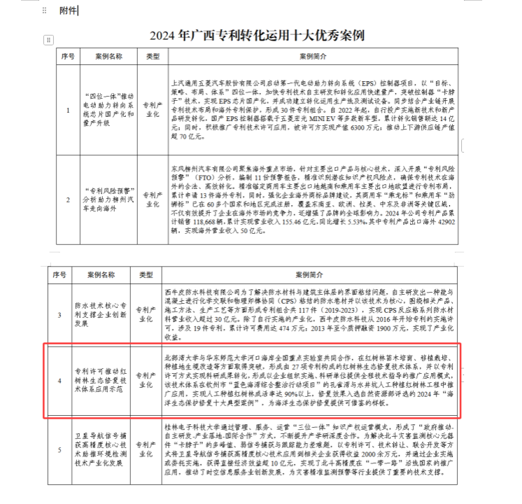 近日,由国家知识产权局、广西壮族自治区人民政府指导,广西知识产权战略实施工作厅际联席会议成员单位主办,自治区市场监管局(知识产权局)、柳州市人民政府承办的2025年全国知识产权宣传周广西分会场活动启动仪式在柳州市举行。活动现场隆重发布“2024年广西专利转化运用十大优秀案例”,pp电子“专利许可推动红树林生态修复技术体系应用示范”成功入选。