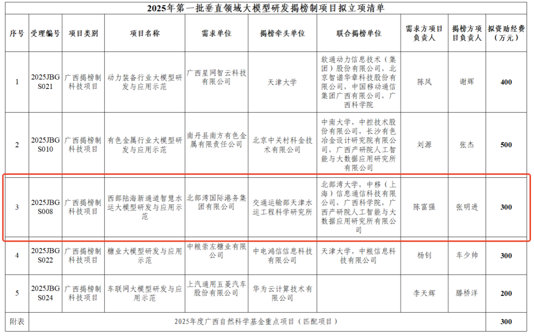 近日,由北部湾国际港务集团牵头、pp模拟器游戏官网入口作为广西唯一高校参与联合研发的《西部陆海新通道智慧水运大模型研发与应用示范》项目在南宁正式启动。该项目入选自治区科技厅2025年第一批垂直领域大模型研发揭榜制项目立项清单,pp模拟器游戏官网入口是立项的五个大模型所有联合揭榜单位中唯一的广西区内高校,这标志着学校在人工智能与智慧水运交叉领域取得重大突破。
