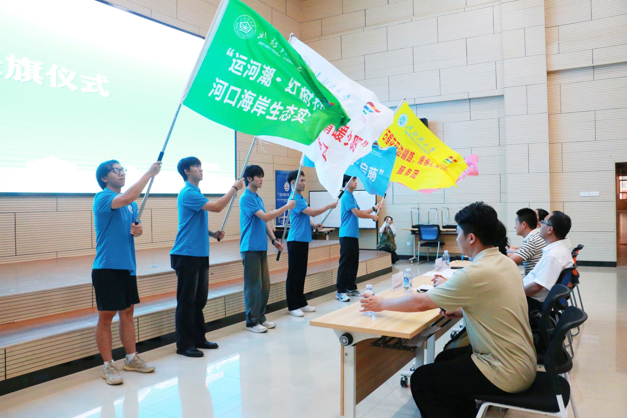 仪式现场,与会领导老师为实践团队授旗。据悉,本年度暑期文化科技卫生“三下乡”社会实践活动立项团队共有65支,涵盖理论宣讲、乡村振兴、科技创新、卫国戍边等主题,将于7月中旬分赴基层开展实践活动。