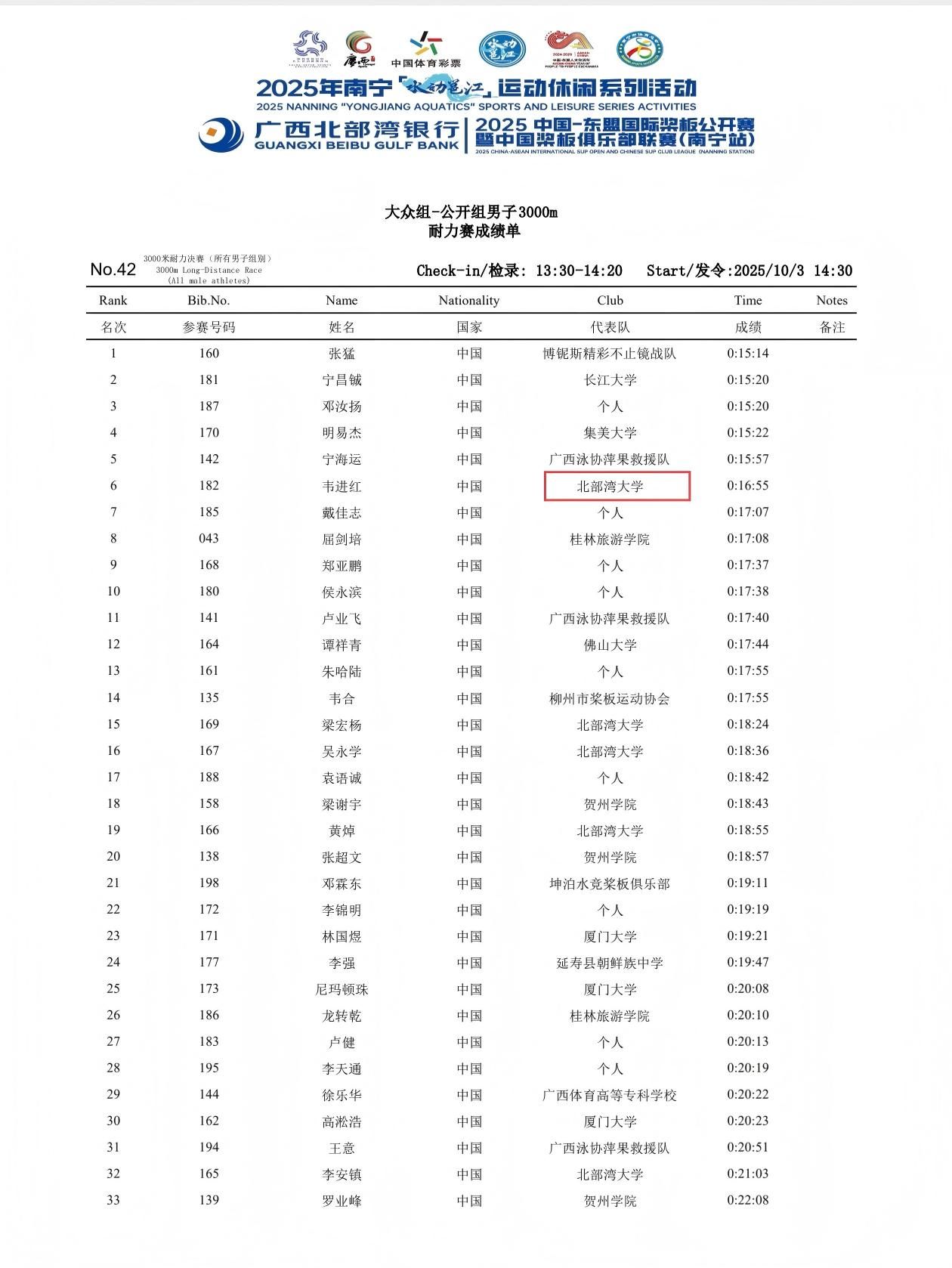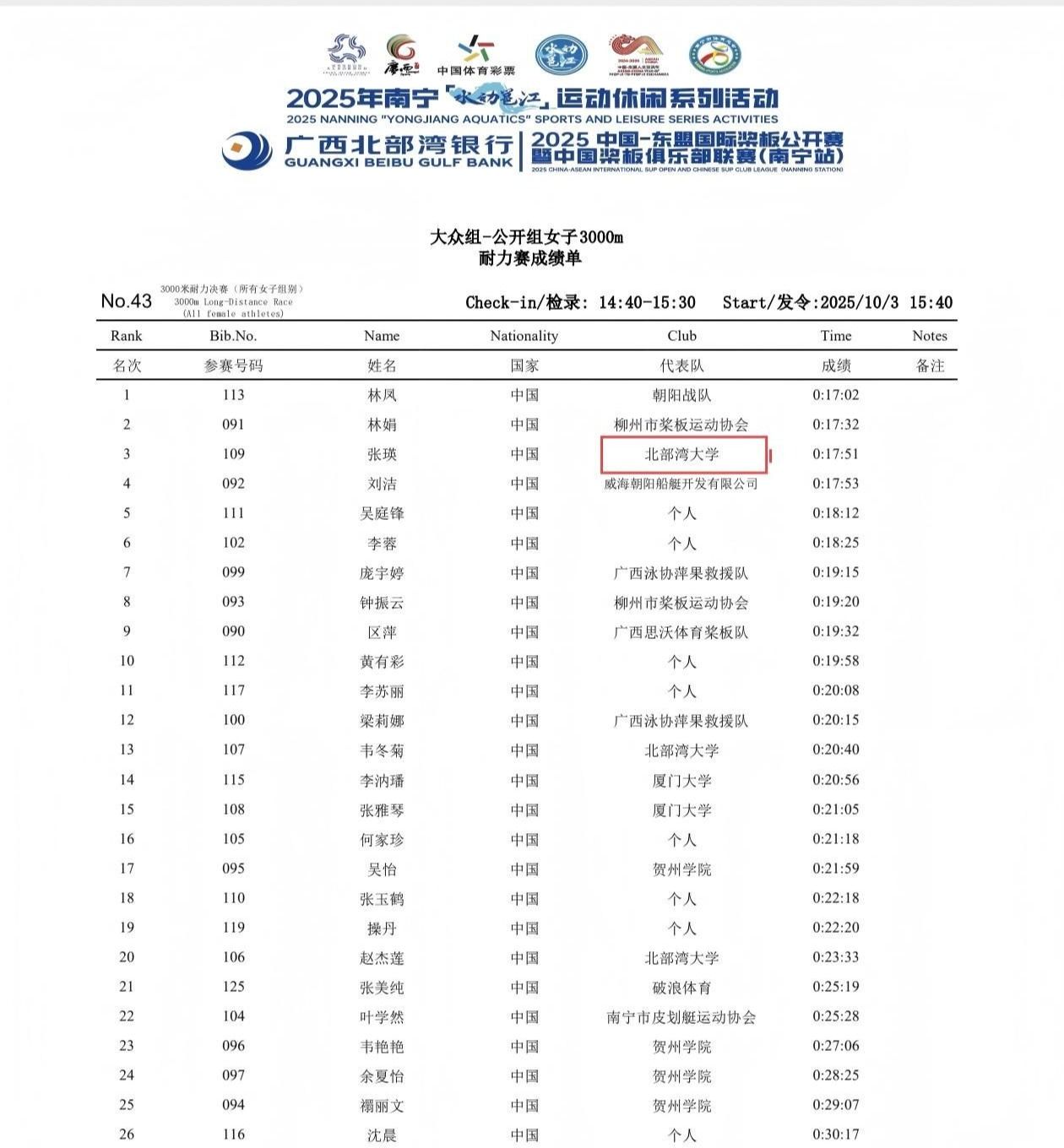 体教本231班学生张瑛凭借流畅的划行节奏与出色爆发力,勇夺大众组-校园组200米冲刺赛女子组冠军;体教本242班学生吴永学沉着应战、稳扎稳打,摘得大众组-校园组200米冲刺赛男子组桂冠。在大众组-公开组3000米耐力赛中,再次出战的张瑛沉着应战,科学分配体力,拼得女子组第三名;体教本232班学生韦进红发挥稳定,取得男子组第六名。