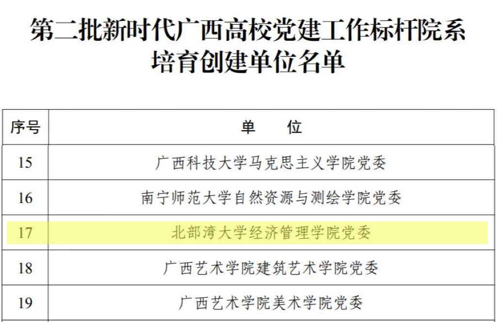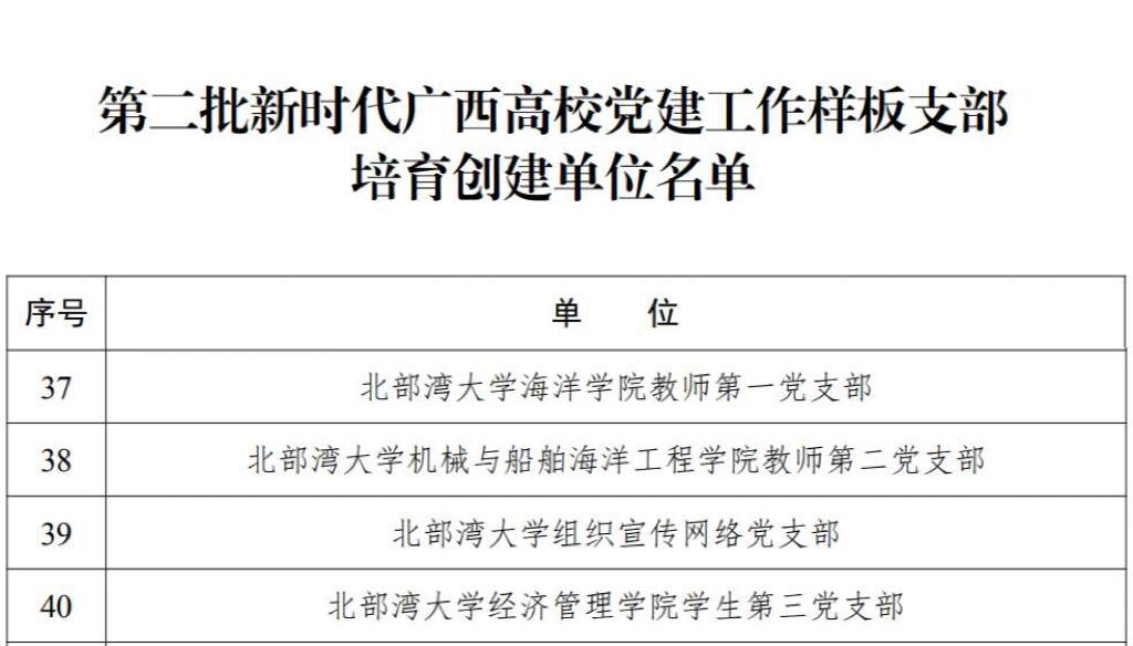近日,自治区党委教育工委公布了第二批新时代广西高校党建示范创建和质量创优工作培育创建单位的名单,确定了5个党建工作示范高校、50个标杆院系、132个样板支部培育创建单位。pp电子经管学院党委荣获新时代广西高校党建工作标杆院系培育创建单位,海洋学院教师第一党支部、机船学院教师第二党支部、组织宣传网络党支部、经管学院学生第三党支部4个党组织荣获第二批新时代广西高校党建工作样板支部培育创建单位。