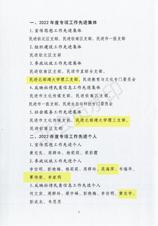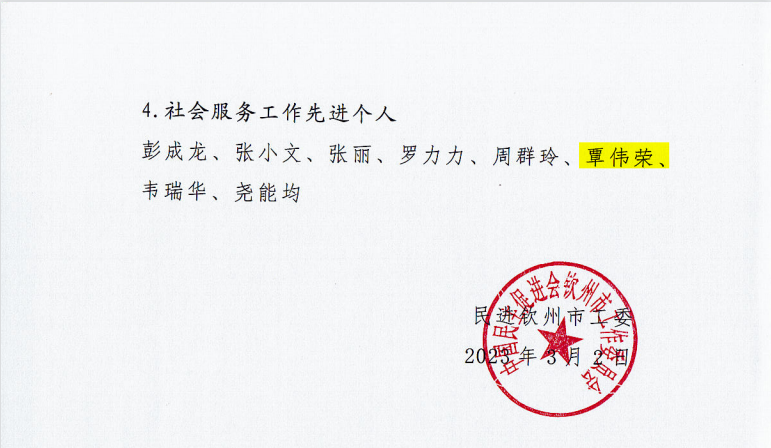 3月4日,民进钦州市工委表彰会议在开投大厦举行,根据《民进钦州市工委关于表彰2022年先进集体和先进个人的决定》,民进pp模拟器游戏官网入口理工支部获参政议政工作先进集体和社会服务工作先进集体,pp电子教师吴海萍、覃伟荣、李家明获参政议政工作先进个人,黄志宇获反映社情民意信息工作先进个人。民进钦州市工委副主委(兼)、民进pp模拟器游戏官网入口总支主委梁家海参加表彰仪式,学校多位民进会员教职工现场接受表彰。