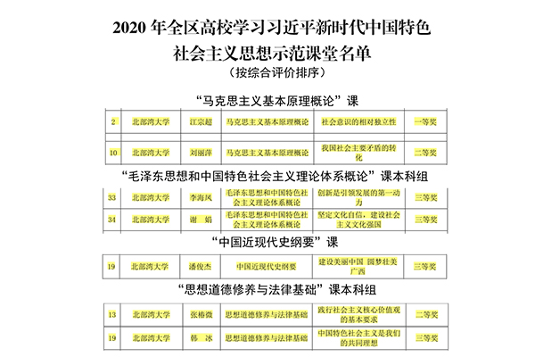 近日,在自治区党委教育工委、自治区教育厅公布的2020年全区高校学习习近平新时代中国特色社会主义思想示范课堂名单中,pp电子马克思主义学院江宗超荣获示范课堂一等奖,刘丽萍、张椿微荣获示范课堂二等奖,李海凤、谢娟、潘俊杰、韩冰荣获示范课堂三等奖。
