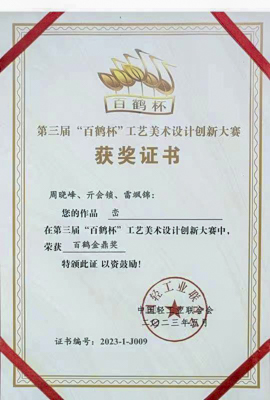 周晓峰教授荣获第三届中国工艺美术创新设计大赛最高奖“百鹤杯”金鼎奖和“百花杯”铜奖