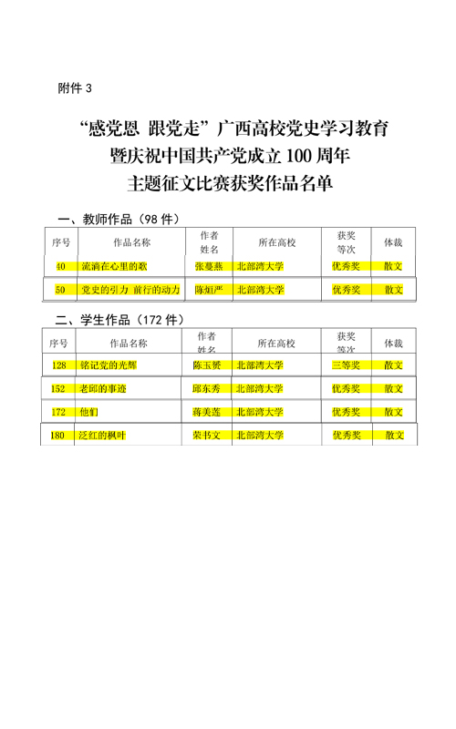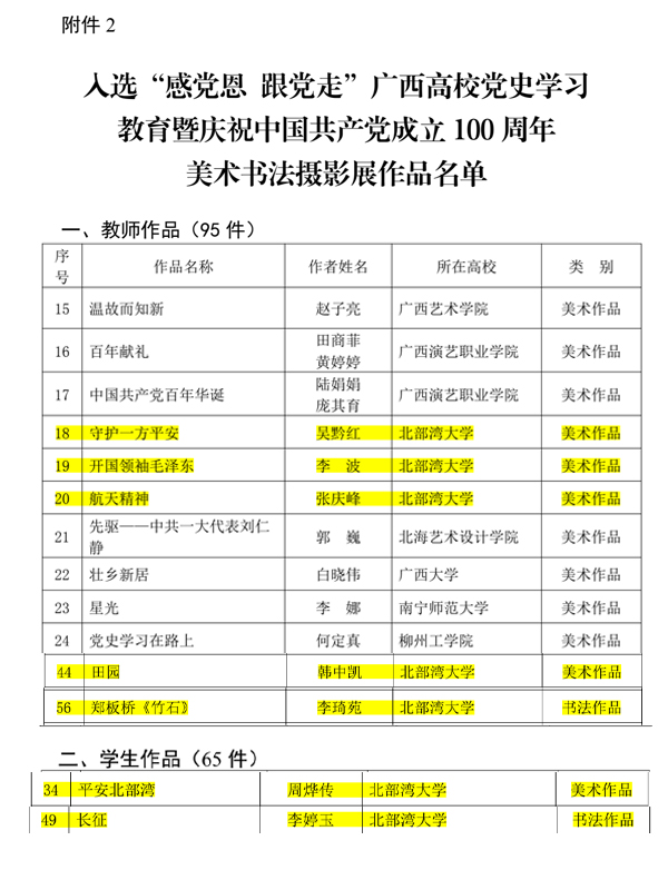 近日,自治区党委教育工委、自治区教育厅公布了“感党恩 跟党走”广西教育系统党史学习教育暨庆祝中国共产党成立100周年系列活动入选参展及获奖的名单。pp电子师生有7个作品入选美术书法摄影展作品名单,有6个作品分别荣获主题征文比赛三等奖和优秀奖。