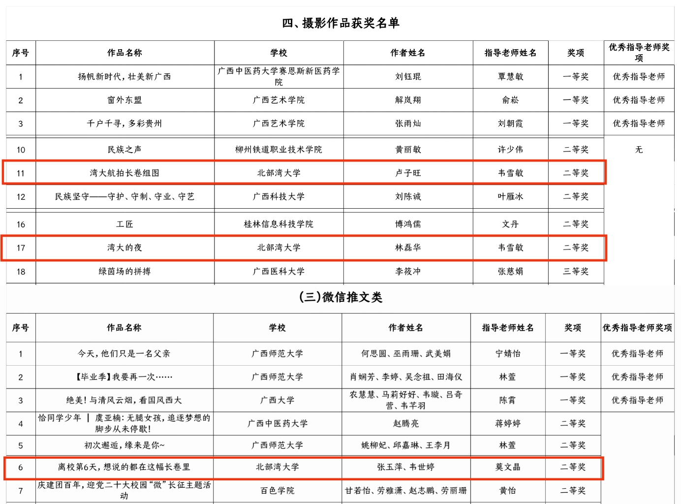 近日,由自治区教育厅会同自治区党委网信办组织开展的第八届全区大学生网络文化节和2022年全区高校网络教育优秀作品推选展示活动评选结果揭晓,pp电子选送的摄影作品《湾大航拍长卷组图》《湾大的夜》,微信推文作品《离校第6天,想说的都在这幅长卷里》均荣获二等奖。