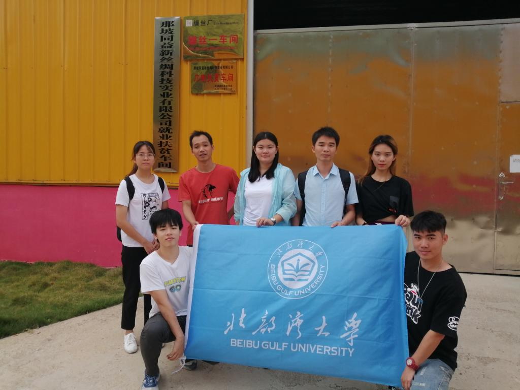 pp电子师生在那坡同益新丝绸科技实业有限公司就业扶贫车间前合影