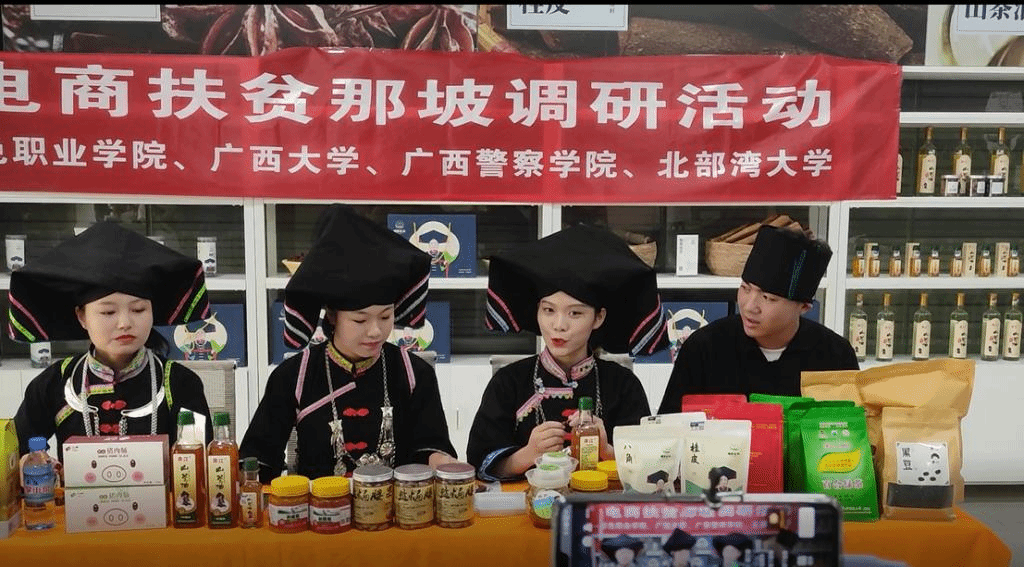 为帮助拓展那坡县特色助农产品的销售渠道,团队师生随后前往那坡县电商公共服务中心,开展电商直播活动。“带货主播”团队,在镜头前向广大网友们推荐那坡助农产品,推动那坡优质农产品走向全国,积极提升农产品附加值,助推电商扶贫和消费扶贫。