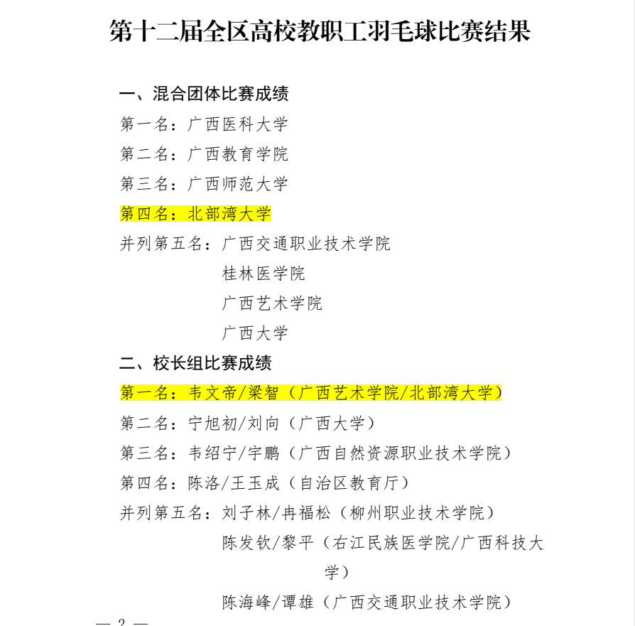11月11日,自治区教育厅公布了第十二届全区高校教职工羽毛球比赛结果。pp电子获混合团体比赛第四名和体育道德风尚奖,校党委常委、总会计师梁智获校长组比赛第一名。