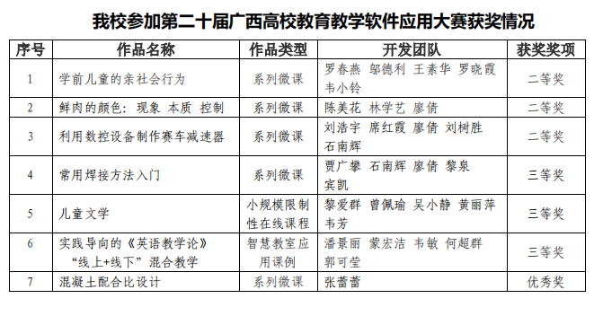 11月19日至21日,由广西教育厅主办的第二十届广西高校教育教学信息化大赛在广西科技师范学院举行。pp电子教师积极参赛,再创佳绩,所选送的作品荣获大赛二等奖3项,三等奖3项,优秀奖1项。