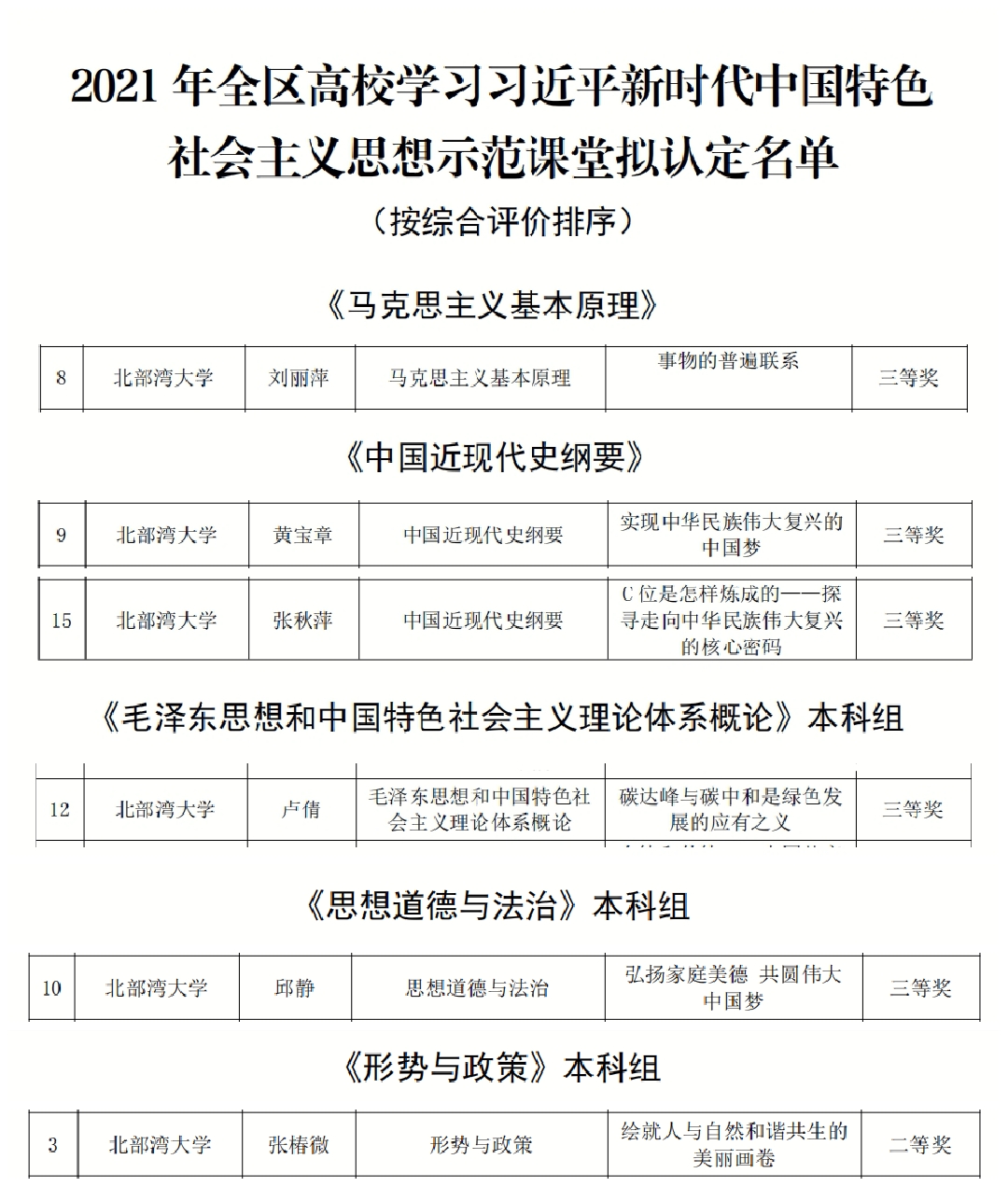 11月12日,自治区党委教育工委、自治区教育厅公布了2021年全区高校学习习近平新时代中国特色社会主义思想示范课堂名单。pp电子马克思主义学院教师喜获6个奖项。其中,张椿微荣获二等奖,刘丽萍、黄宝章、张秋萍、卢倩、邱静均荣获三等奖。