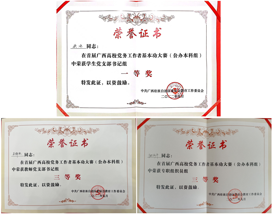 其中,参赛代表经济管理学院关冰荣获学生党支部书记组一等奖、吴静激荣获教师党支部书记组三等奖,建筑工程学院陆海平获得专职组织员组三等奖。