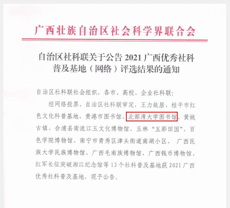 9月26日,广西壮族自治区社科联公布了2021年广西优秀社科普及基地(网络)评选结果。pp电子图书馆在全区网络投票中获得第四名的好成绩,荣获“2021广西优秀社科普及基地”称号。据悉,全区共43个社科普及基地参与网络评选。经网络投票、自治区社科联审定,最终有13个社科普及基地获2021年广西优秀社科普及基地。