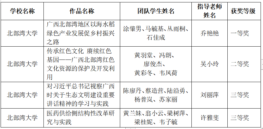 此次活动历时四个月,经历了预赛和决赛两个阶段。吴小玲和乔艳艳分别指导的团队成果参加了2022年11月11-12日在南宁举办的决赛活动。最后,乔艳艳指导的团队成果“广西北部湾地区以海水稻绿色产业发展促乡村振兴之路”获得优秀成果一等奖、吴小玲指导的团队成果“传承红色文化 赓续红色基因——广西北部湾红色文化资源的保护及开发利用”获优秀成果二等奖。此外,刘丽萍老师的团队成果“对习近平总书记视察广西时关于生态文明建设重要讲话精神的学习与实践”、许雅斐老师的团队成果“医药供给侧结构性改革研究与实践”获本次活动的三等奖。