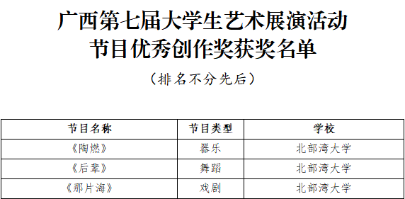 4月15日,广西第七届大学生艺术展演活动获奖名单公布,pp电子获奖项目创历史新高:艺术表演类节目一等奖5个、二等奖6个、三等奖3个,节目优秀创作奖3个;艺术作品类一等奖7件、二等奖5件、三等奖8件;校长书画摄影作品风采奖1件。其中戏剧节目《那片海》、摄影航拍组图《运河之滨 向海图强》入围全国大学生艺术展演。