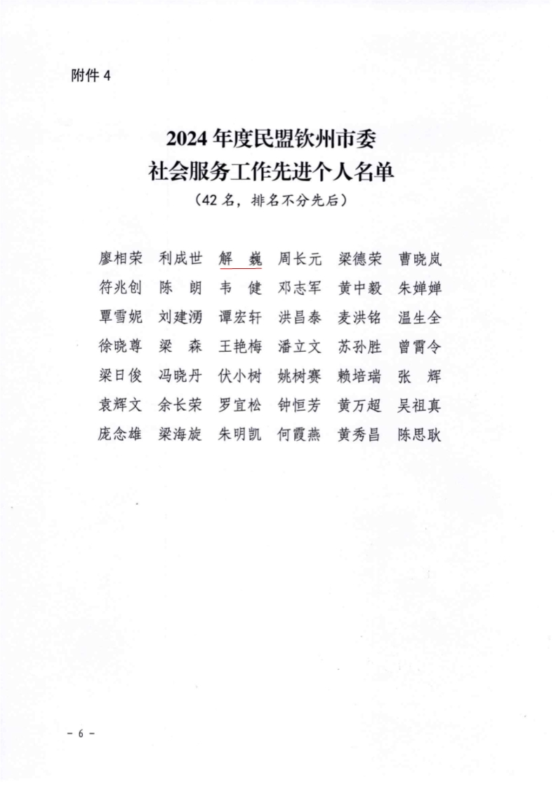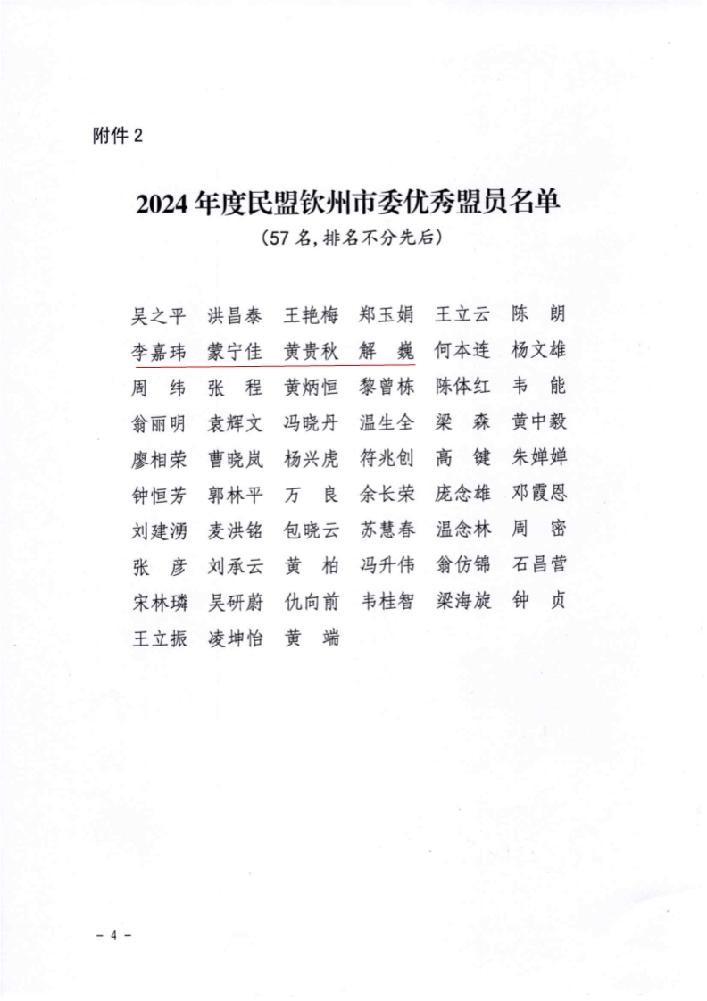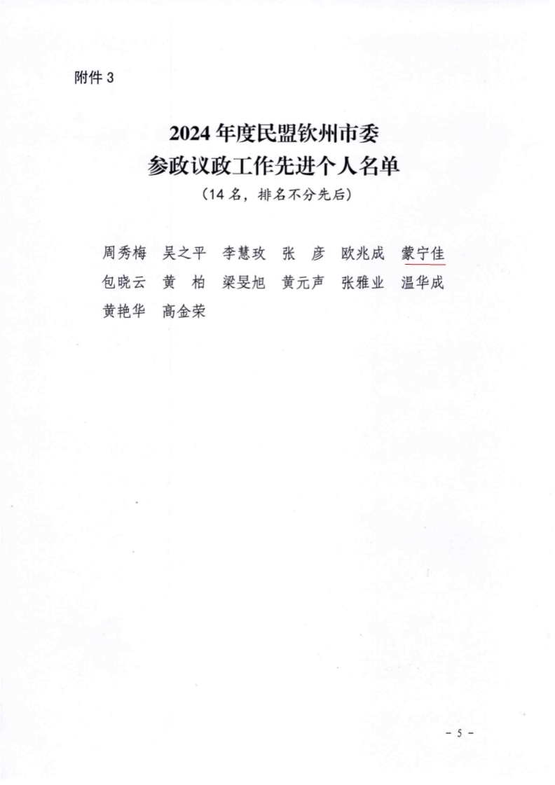 近日,从《民盟钦州市委关于表彰2024年度先进支部、优秀盟员、参政议政先进个人、社会服务先进个人的决定》获悉,pp电子民盟盟员李嘉玮、蒙宁佳、黄贵秋、解巍等荣获2024年度民盟钦州市委优秀盟员荣誉称号;蒙宁佳荣获2024年度民盟钦州市委参政议政工作先进个人荣誉称号;解巍荣获2024年度民盟钦州市委社会服务工作先进个人荣誉称号。