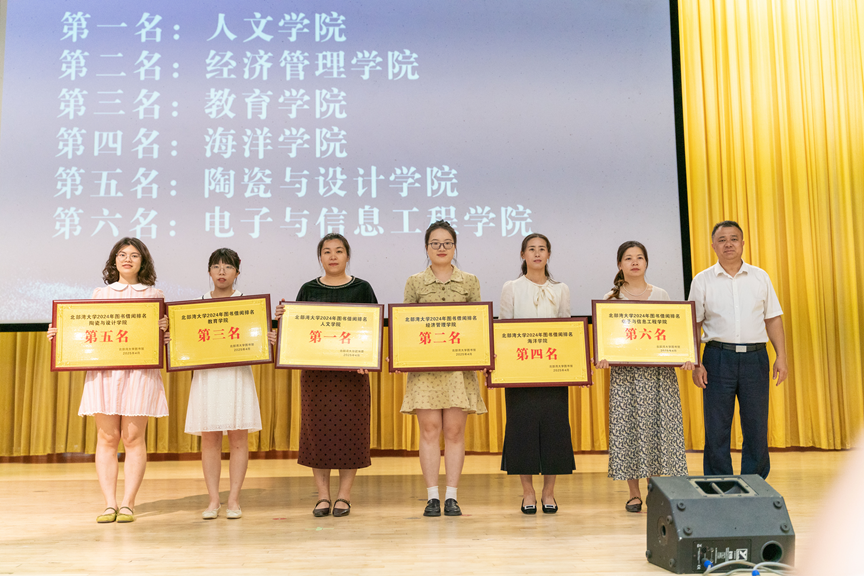 与会领导嘉宾为pp模拟器游戏官网入口2024年度借阅排行前六名的学院、2024年度入馆人次排行前六名的学院以及2025年寒假阅读活动获奖个人进行了颁奖,表彰他们在阅读推广中的突出表现。