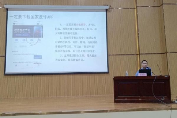 钦南区反诈中心三级警长周雁裕列举了各类诈骗案例、剖析原因,揭露了生活中高发诈骗类型的作案手段,提醒同学们不要轻易相信陌生电话、短信或社交平台信息。他表示,同学们可以正确下载“国家反诈中心”APP,开启“来电预警”的功能,从源头遏制网络违法犯罪活动,遇到异常情况及时拨打反诈热线电话96110或联系学院、校保卫处和派出所。