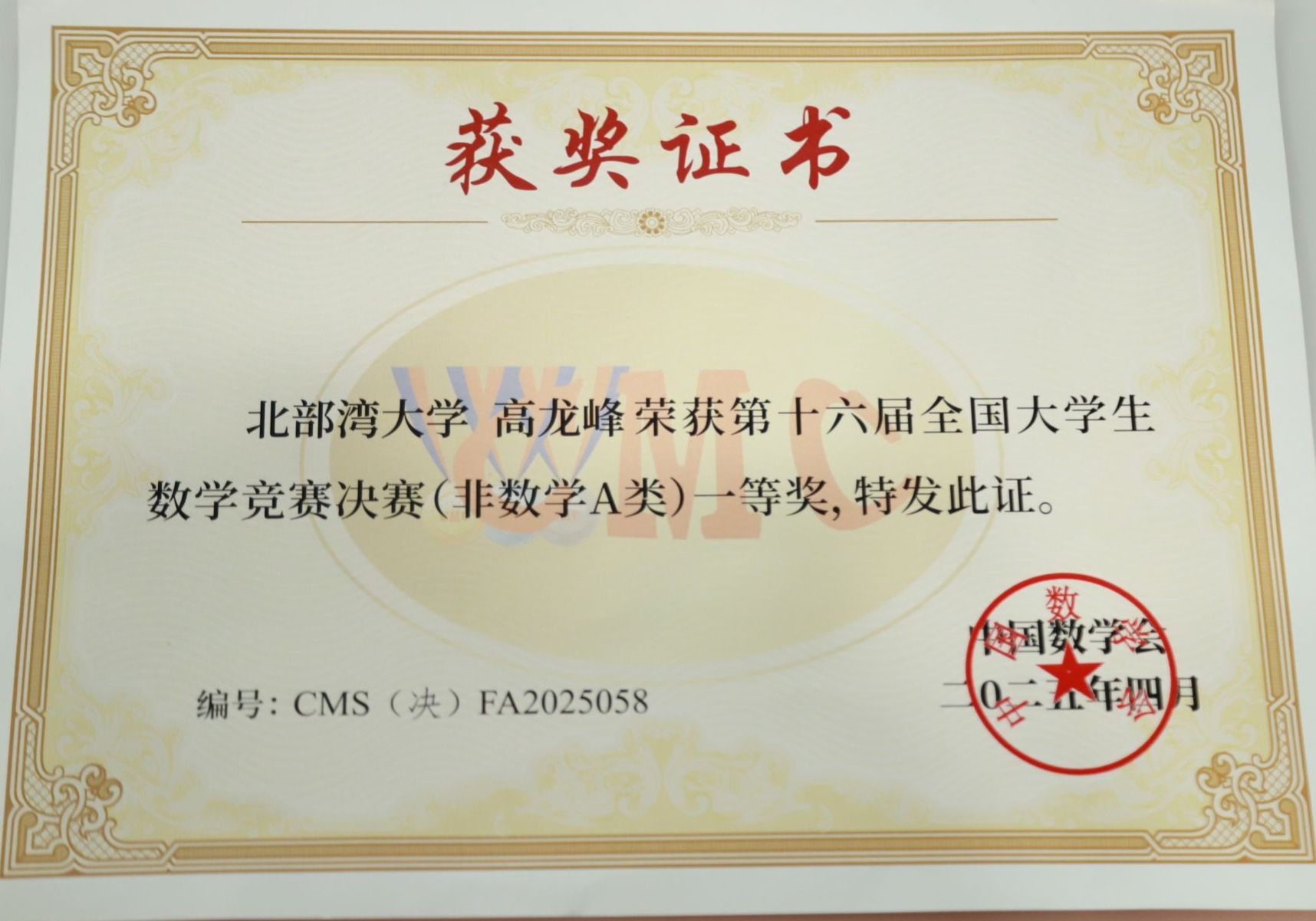 2025年4月,喜报从浙江师范大学举办的第十六届全国大学生数学竞赛决赛现场传来,pp电子机械与船舶海洋工程学院自动化专业241班高龙峰同学以总分广西第一的优异成绩斩获非数学A类组全国一等奖。这刷新了pp电子在该项赛事中的最佳纪录,让这位数学爱好者走进了我们的视野。